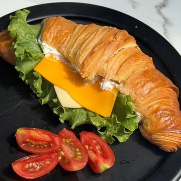 Tereyağlı Kruvasan ; Kaşar, Cheddar, Labne, Kıvırcık ve Çeri domates ile servis edilir.