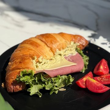 Tereyağlı Kruvasan; Dana Jambon, Kaşar, Pesto aromalı labne, kıvırcık ve Çeri domates ile servis edilir.